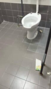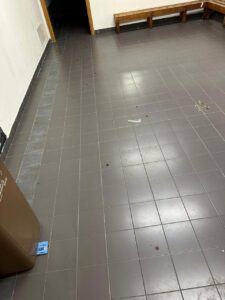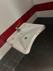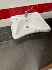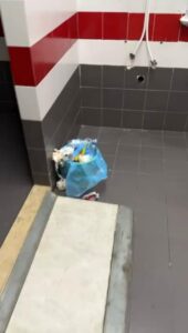 Ancora più grave se si considera che il match in programma era una gara di basket in carrozzina del campionato di serie A, con atleti con disabilità. È impensabile, infatti, trovare lavandini con evidenti macchie di sangue, corridoi nelle stesse condizioni, cestini stracolmi di rifiuti e spogliatoi pieni di bottigliette usate e materiali abbandonati.